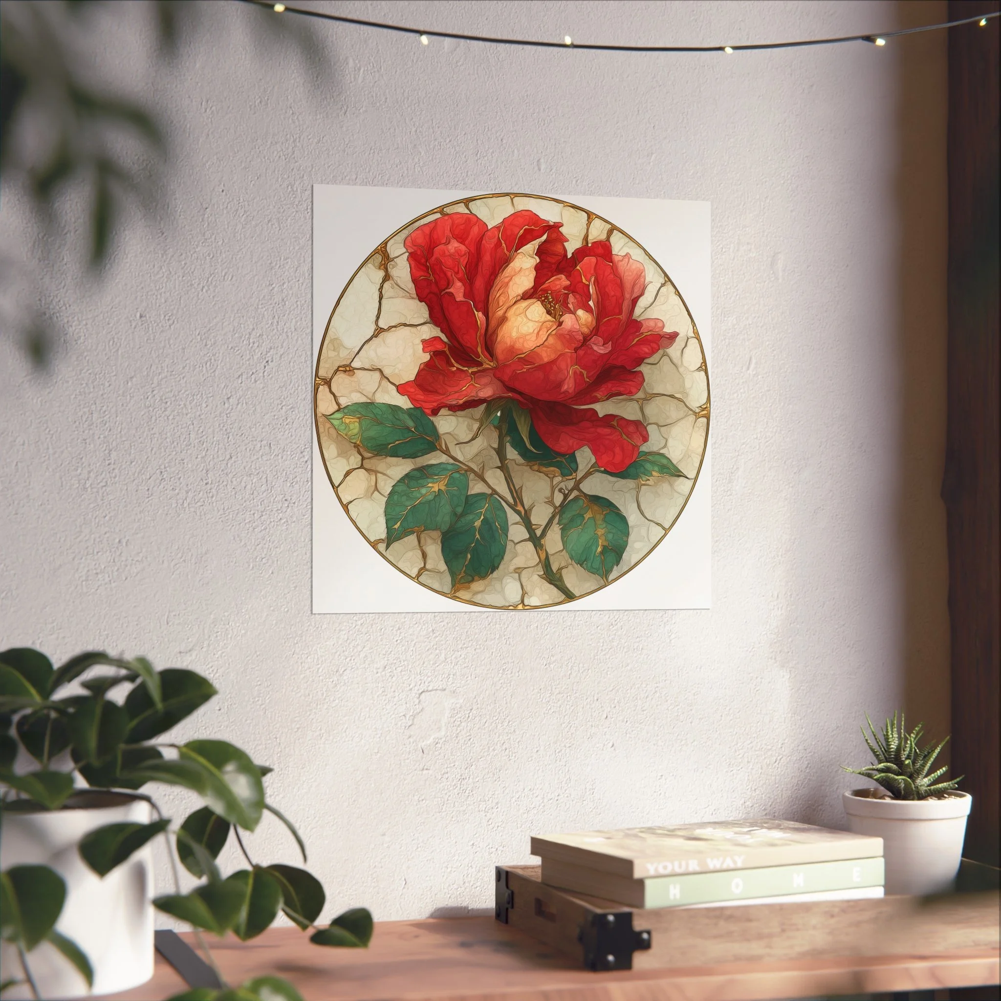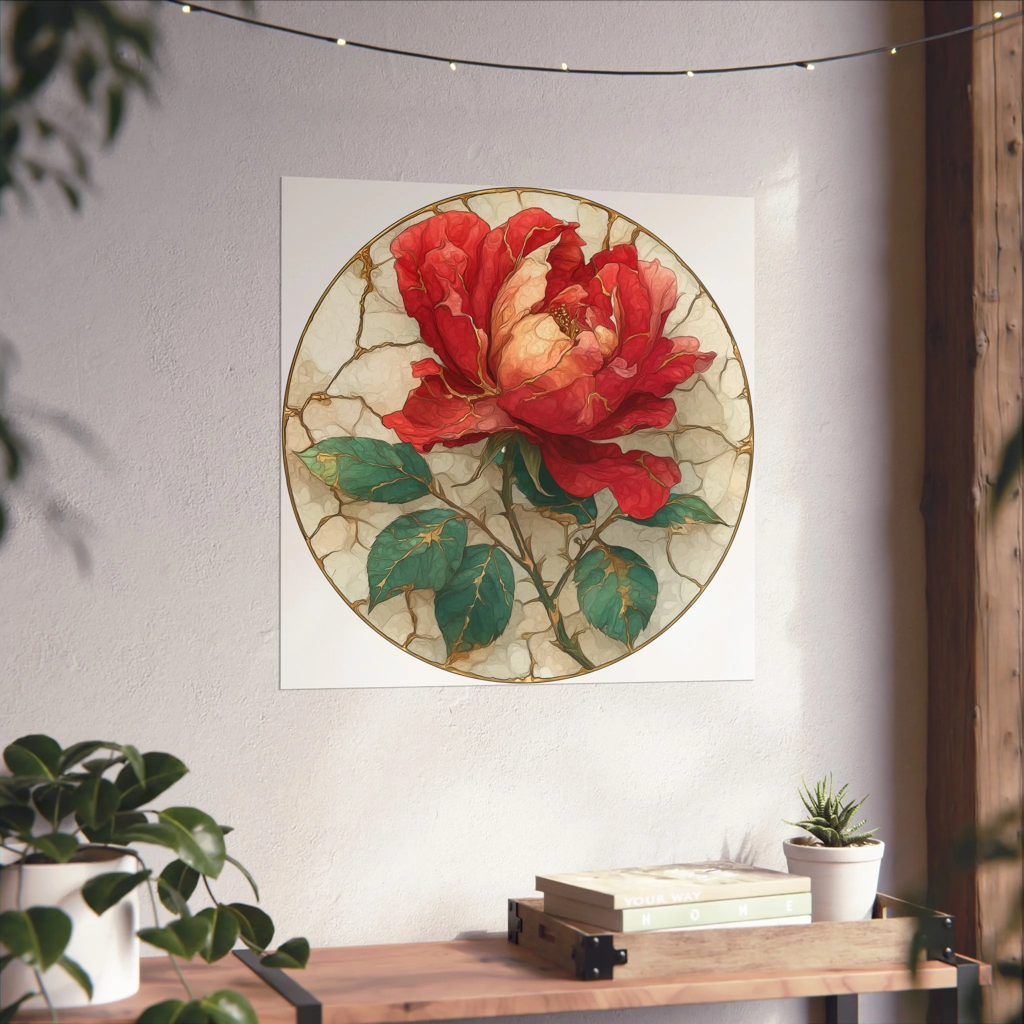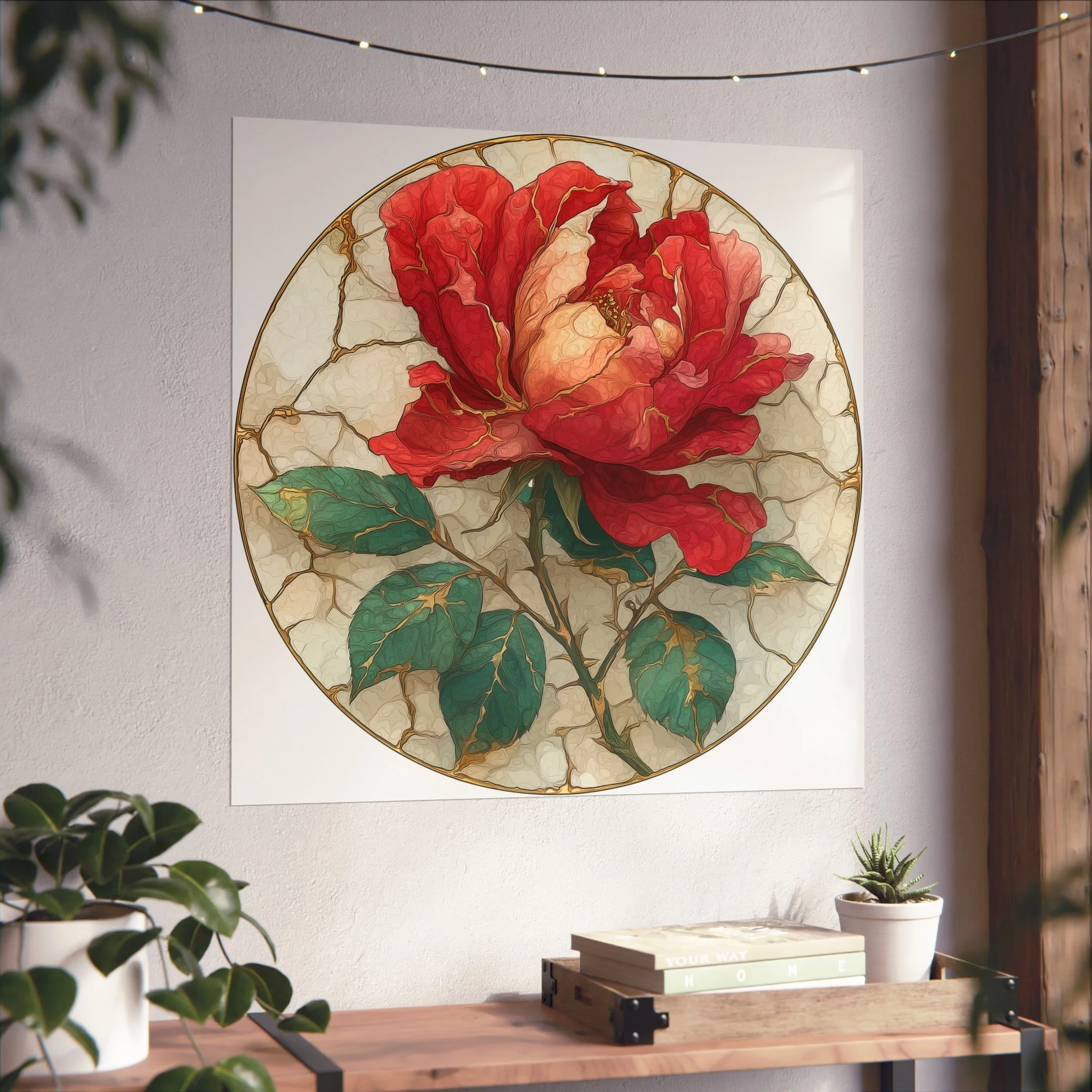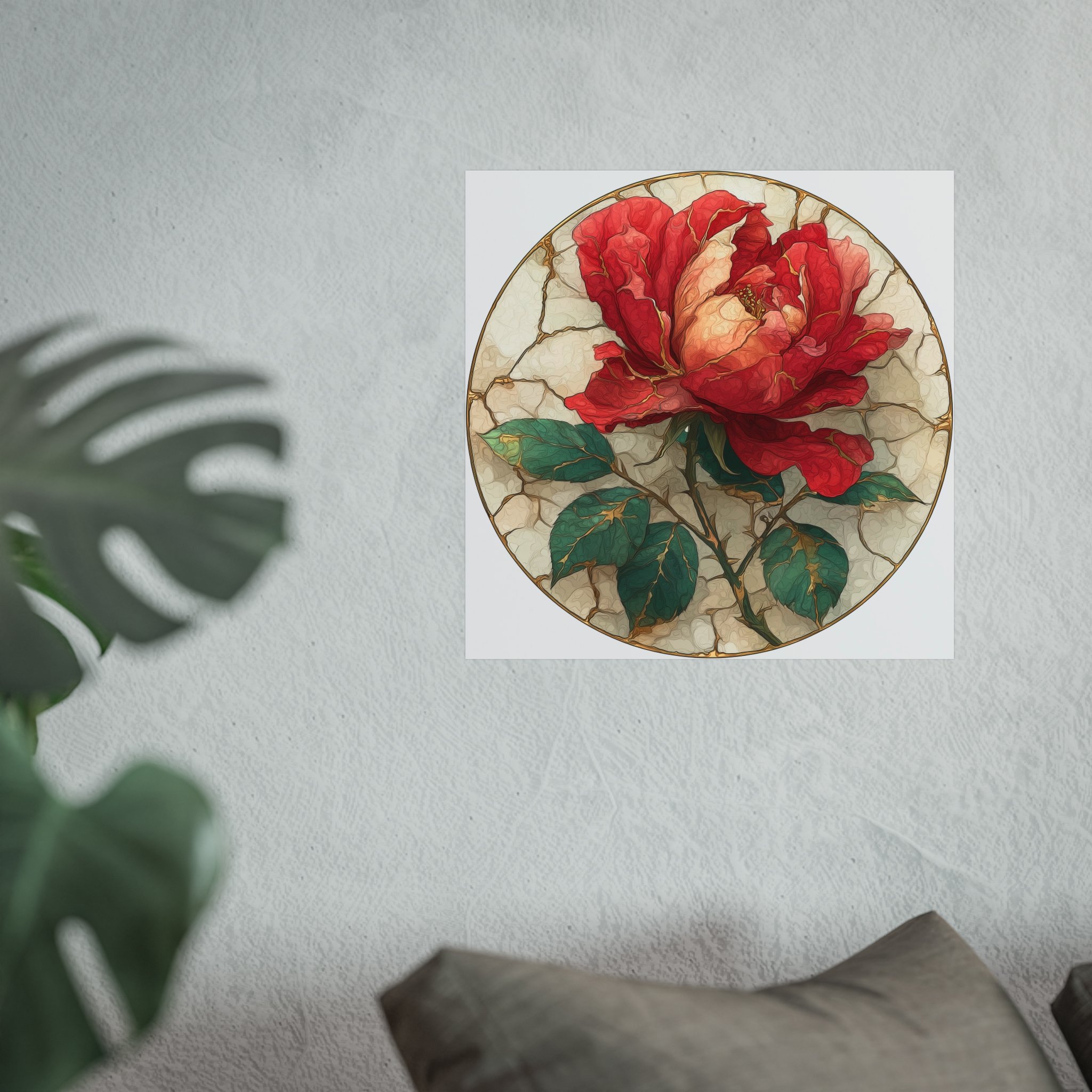This kintsugi-inspired rose artwork highlights delicate gold seam detailing across rich botanical textures. Inspired by the philosophy of repair and renewal, each piece celebrates beauty through imperfection.
