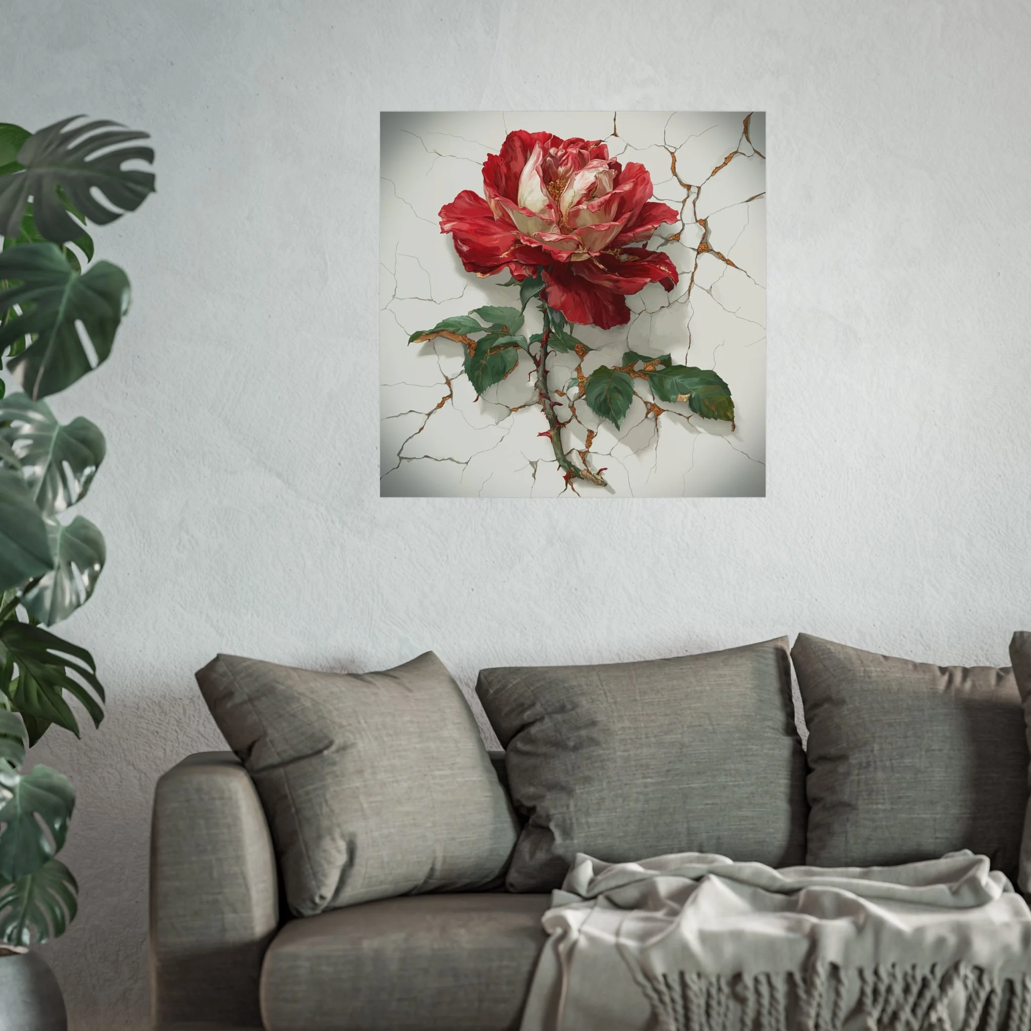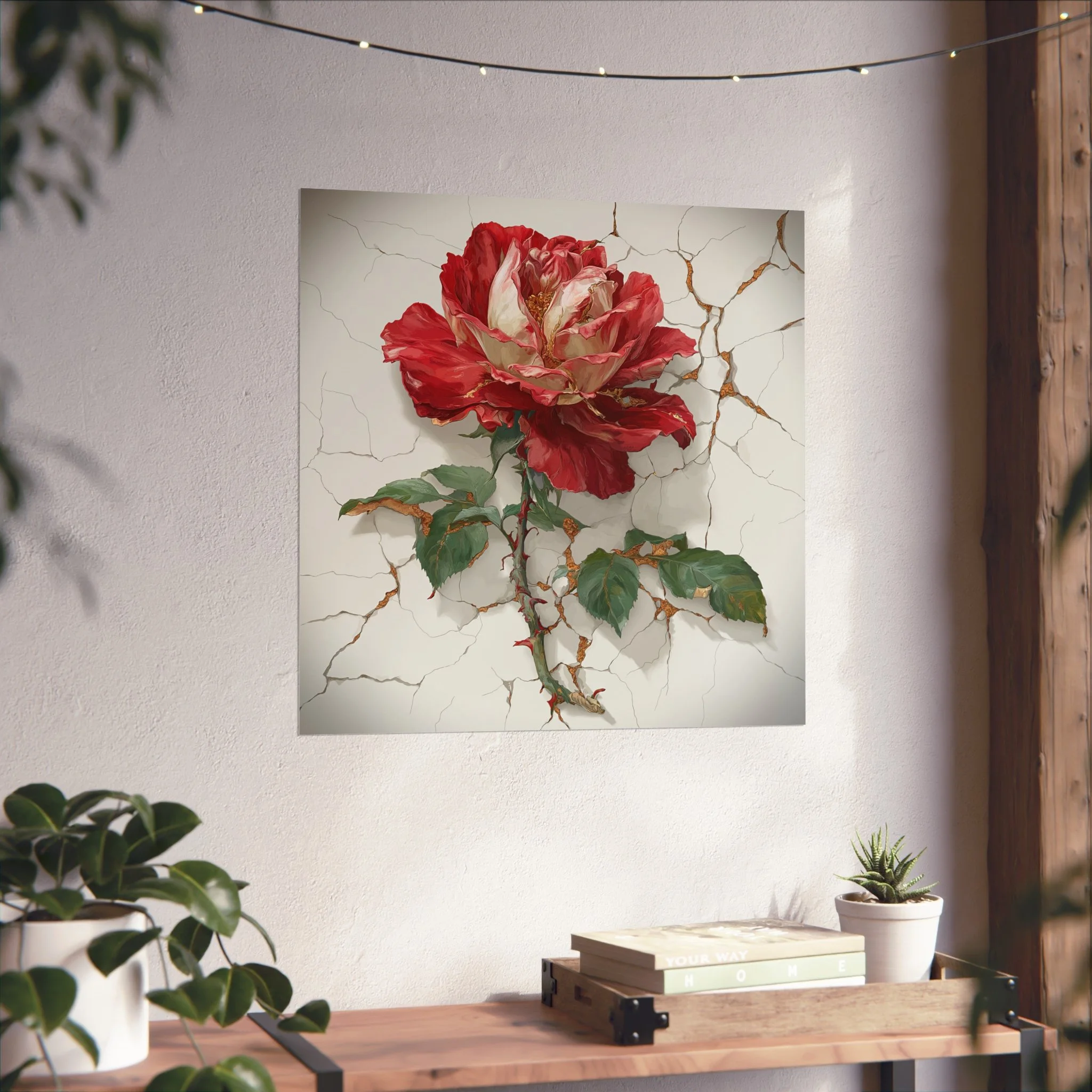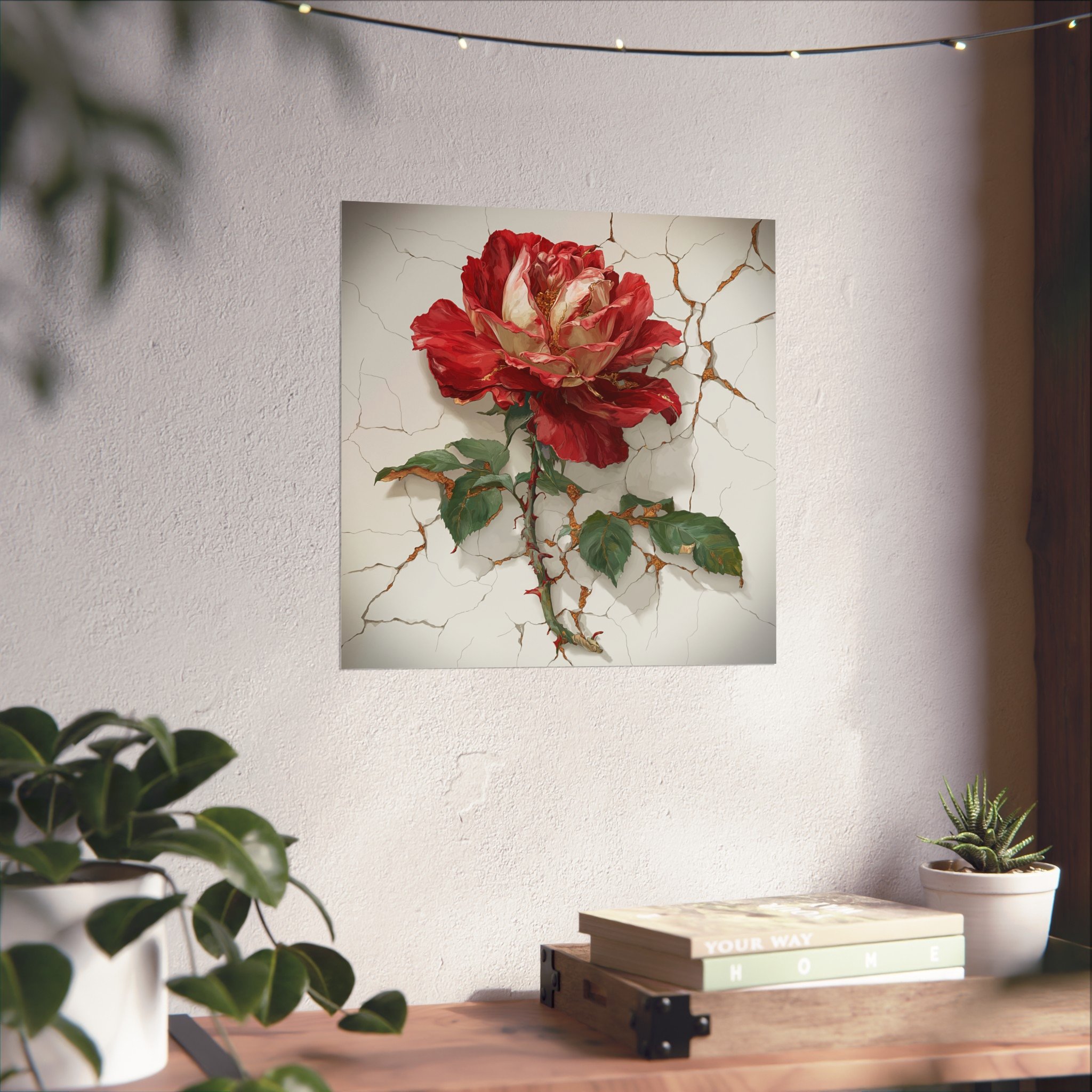 Kintsugi Rose Wall Art – Gold Seam Botanical Print Crimson Bloom No. 01