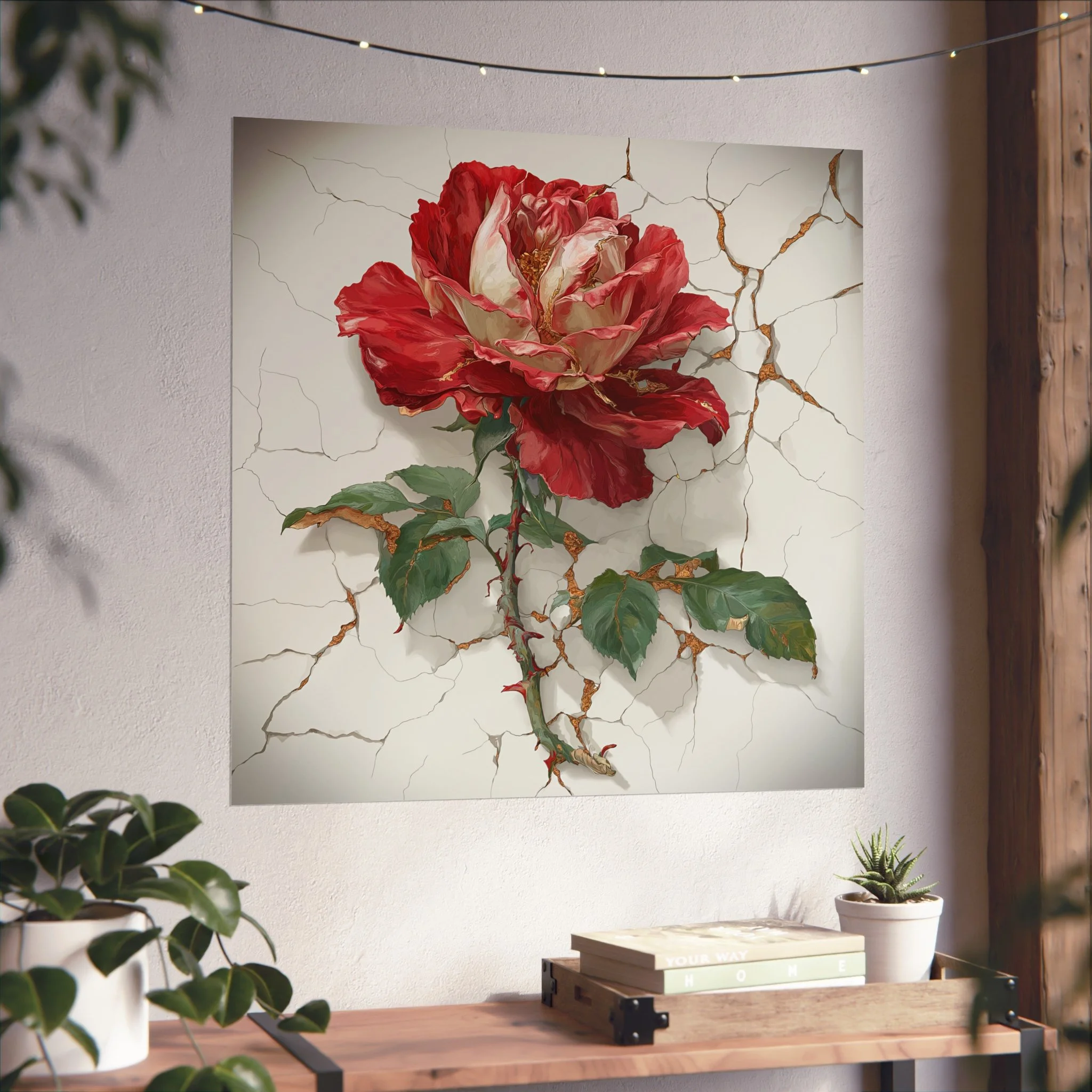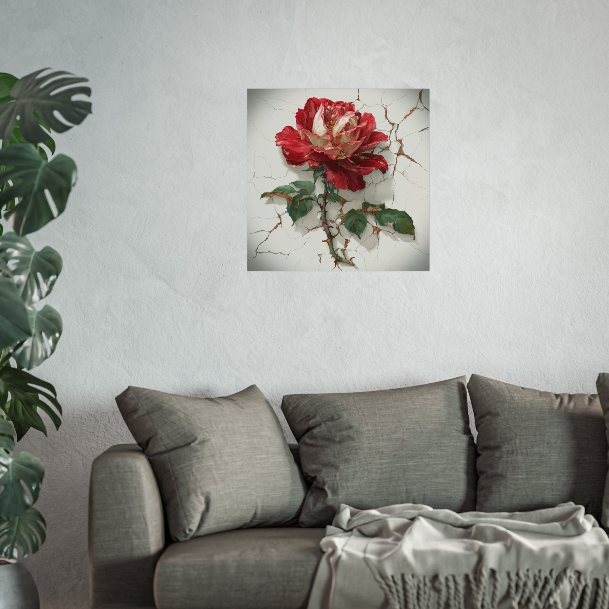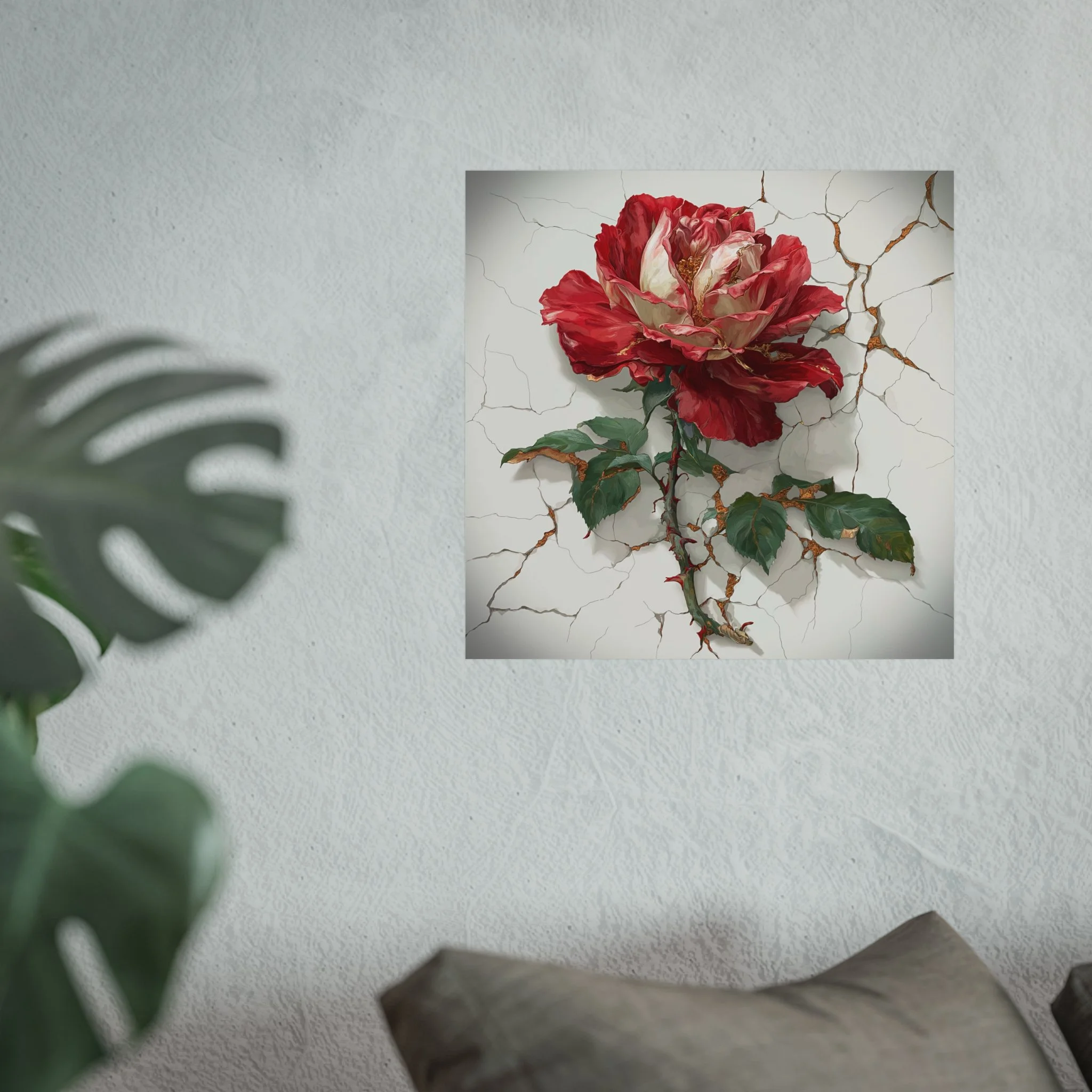 Kintsugi Rose Wall Art – Gold Seam Botanical Print Crimson Bloom No. 01