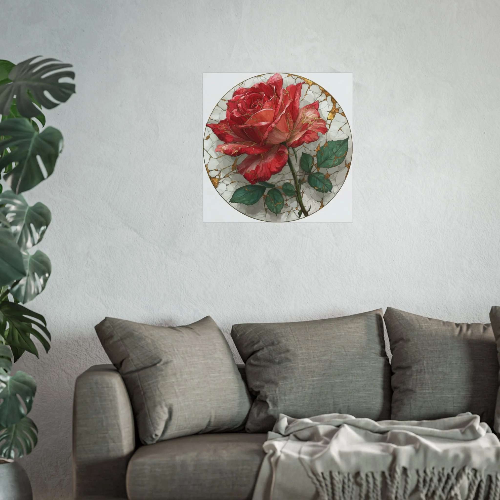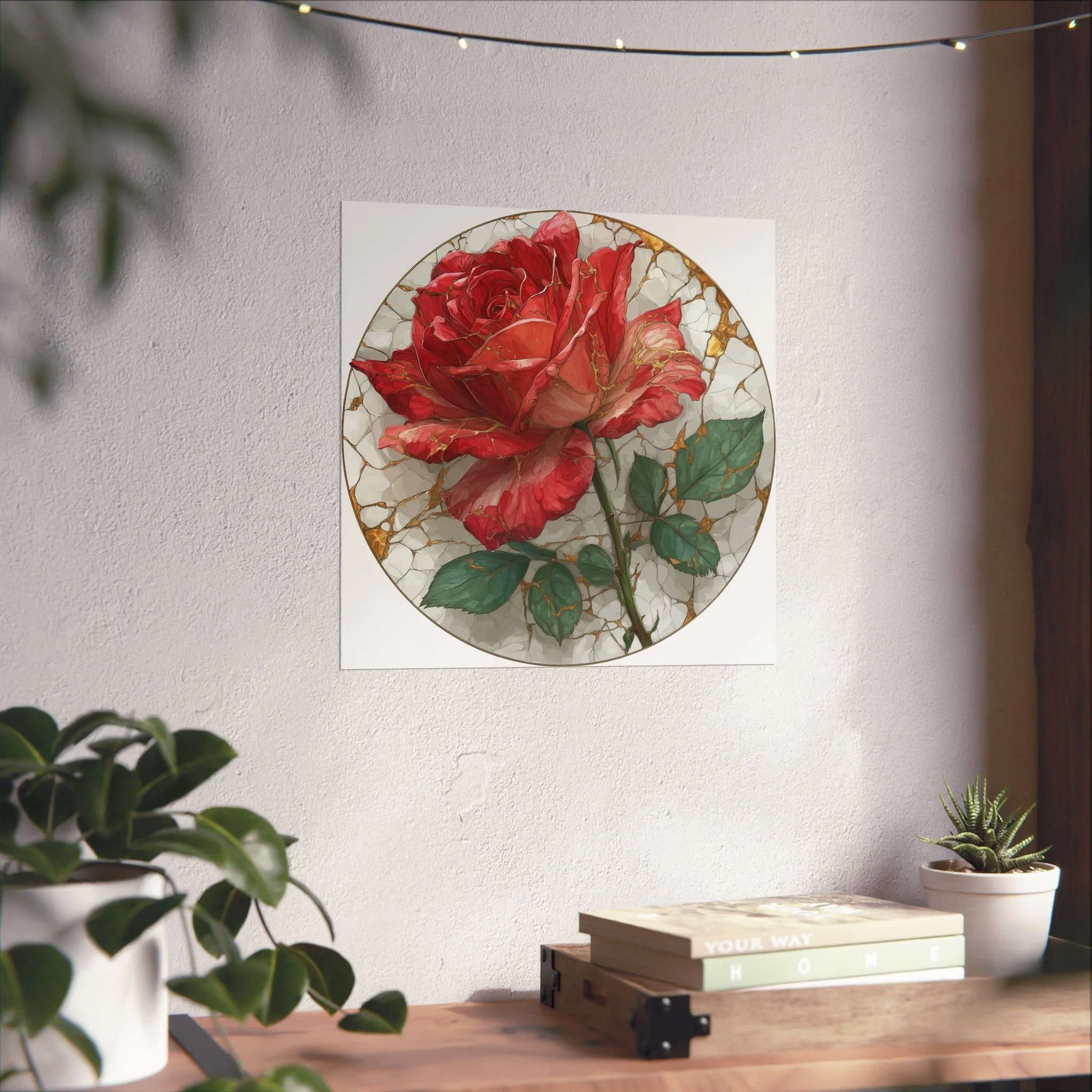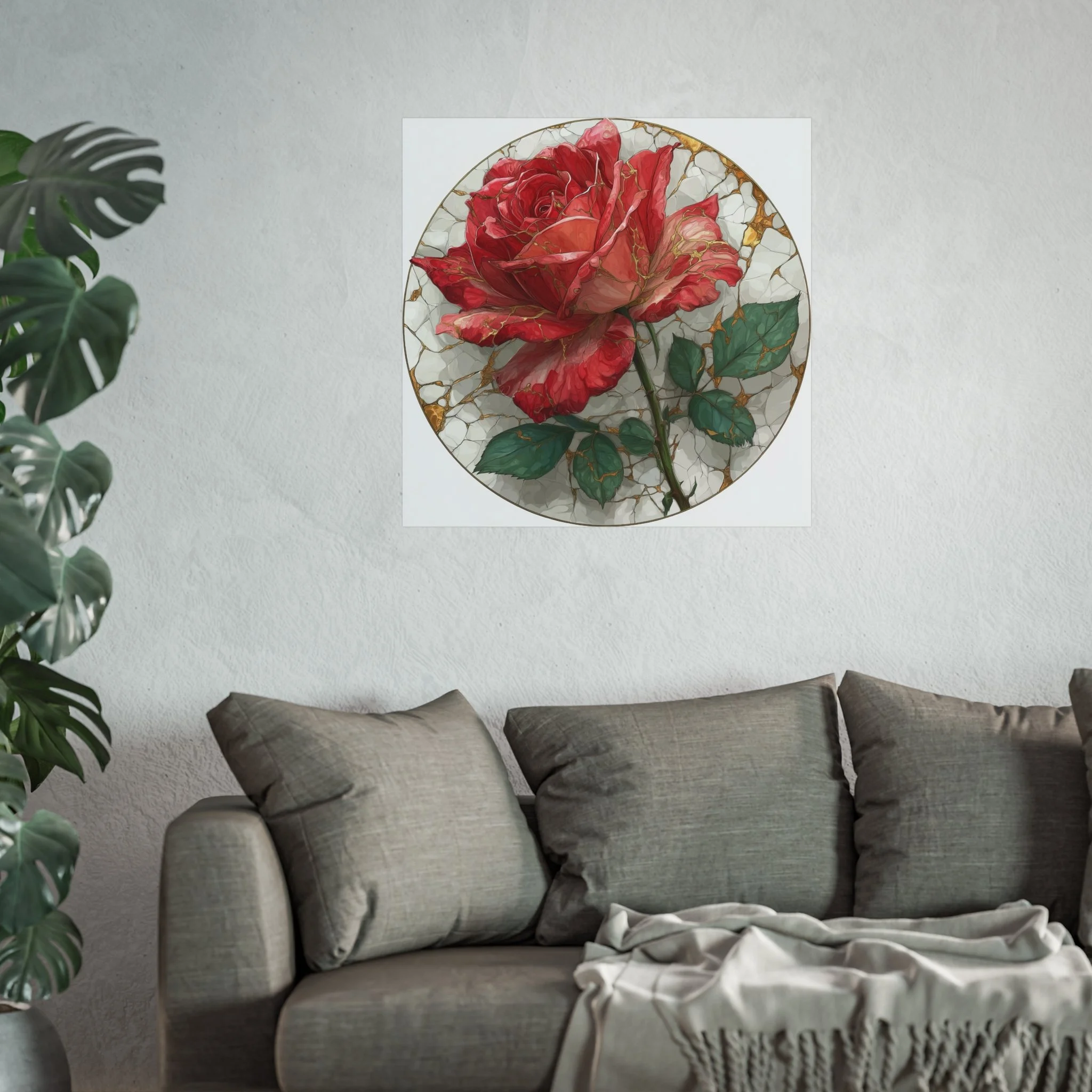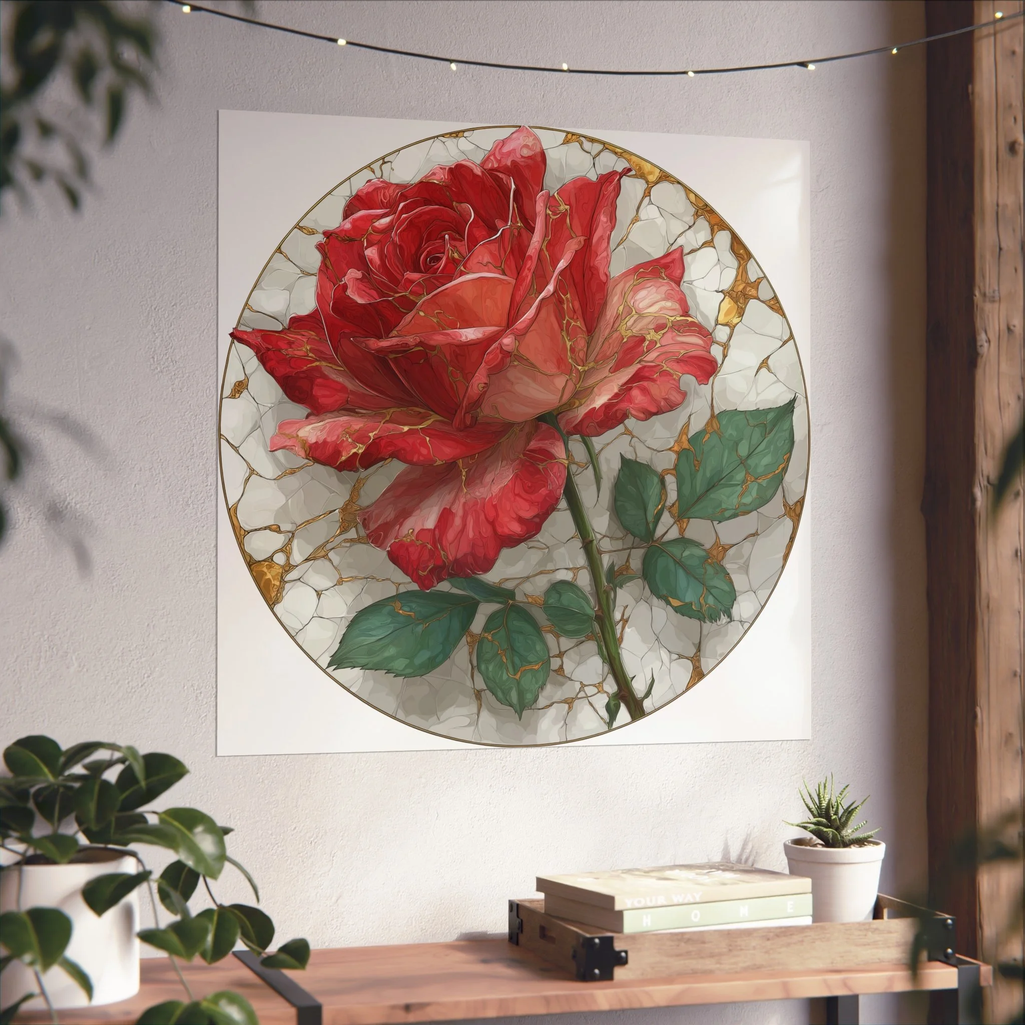 This kintsugi-inspired rose artwork highlights delicate gold seam detailing across rich botanical textures. Inspired by the philosophy of repair and renewal, each piece celebrates beauty through imperfection.