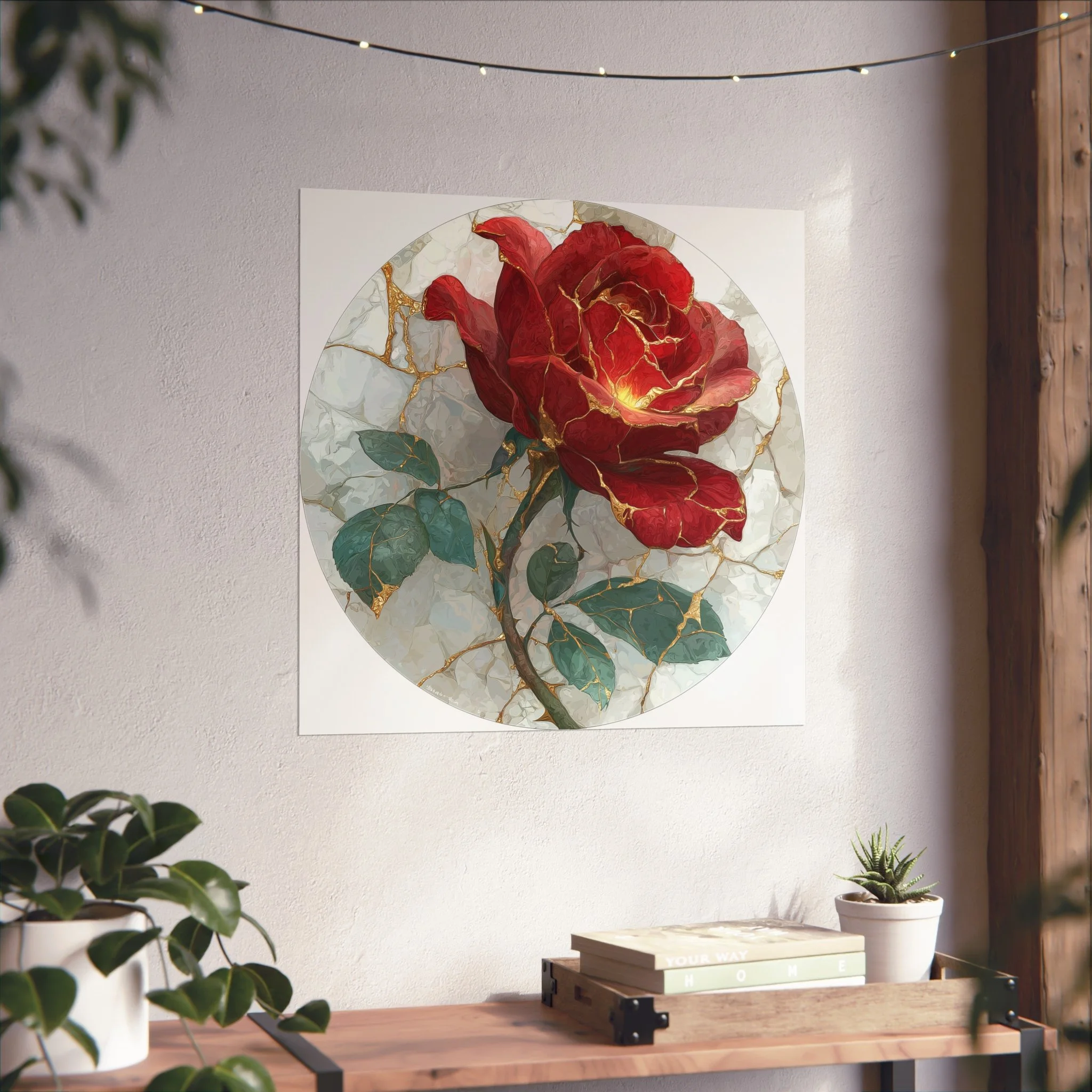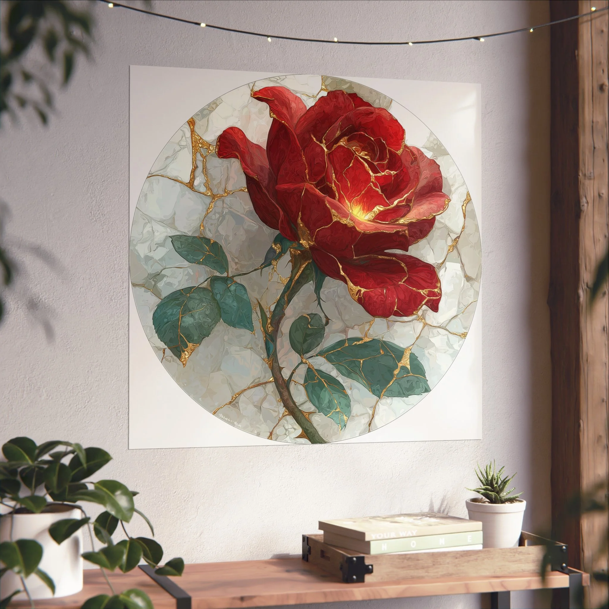 This kintsugi-inspired rose artwork highlights delicate gold seam detailing across rich botanical textures. Inspired by the philosophy of repair and renewal, each piece celebrates beauty through imperfection.