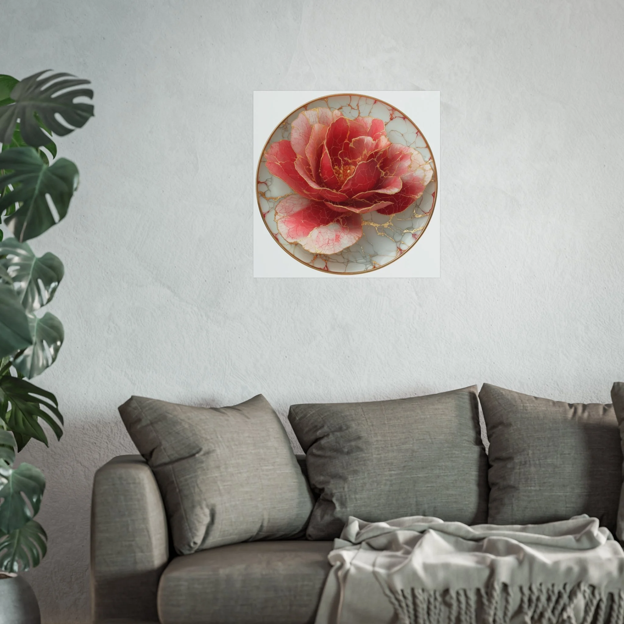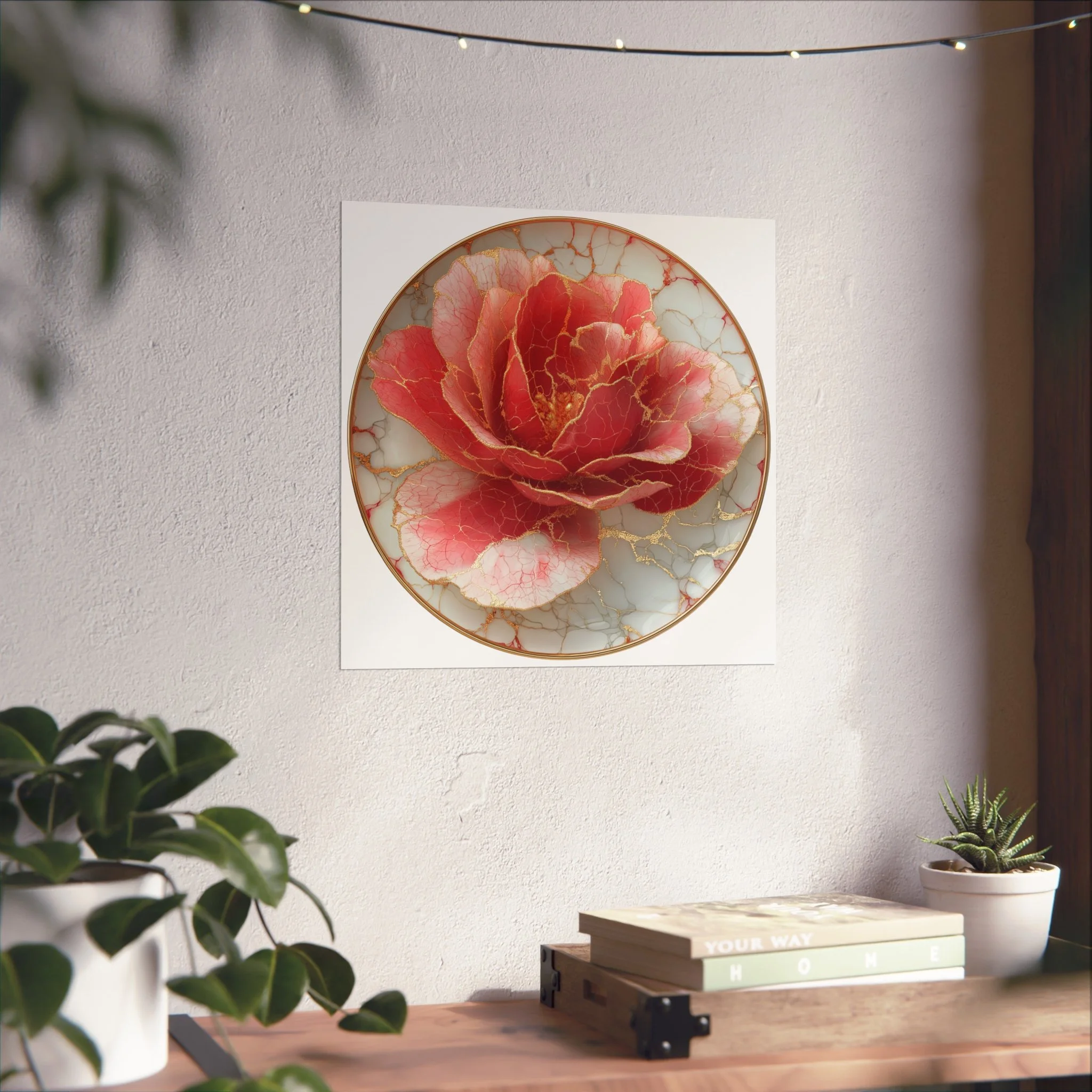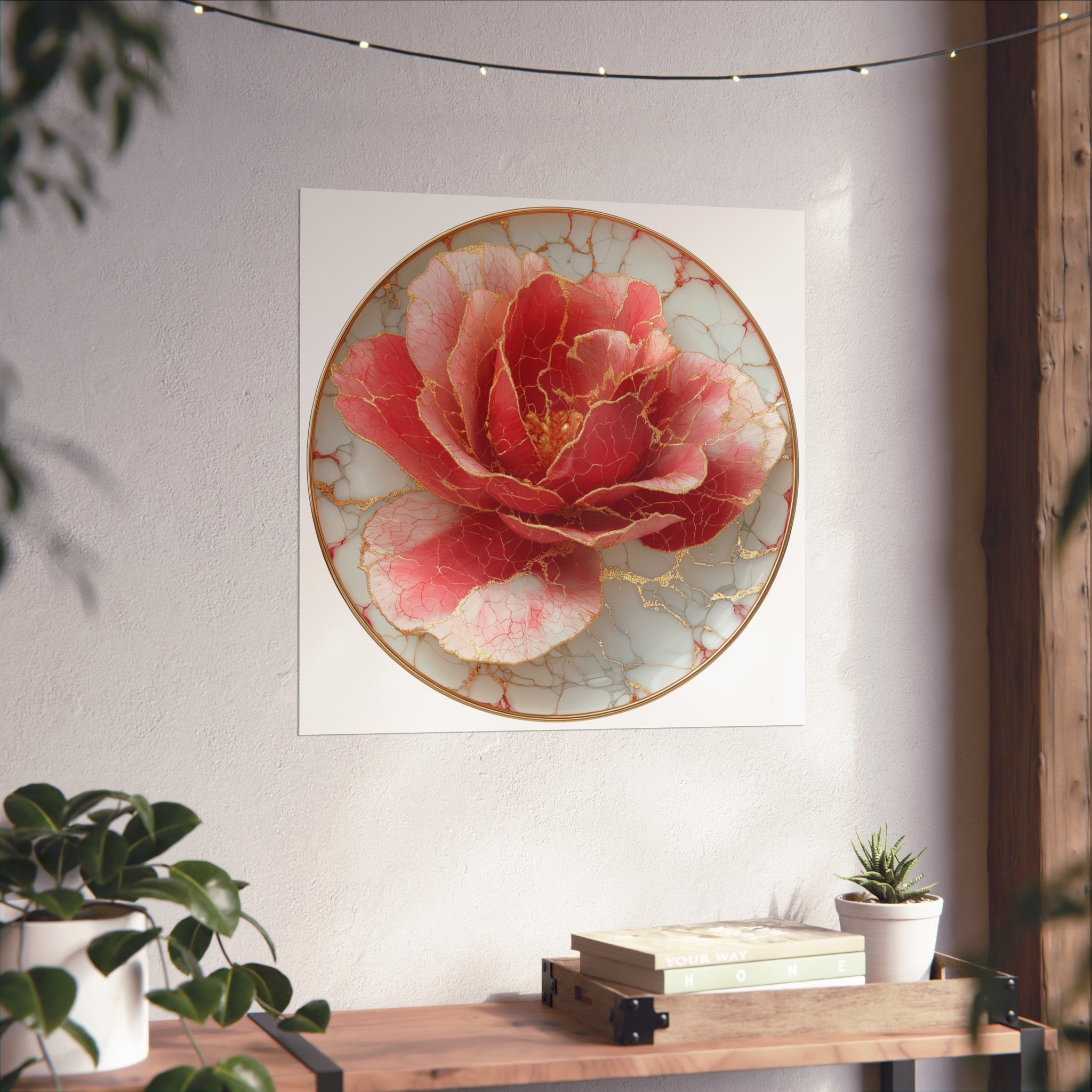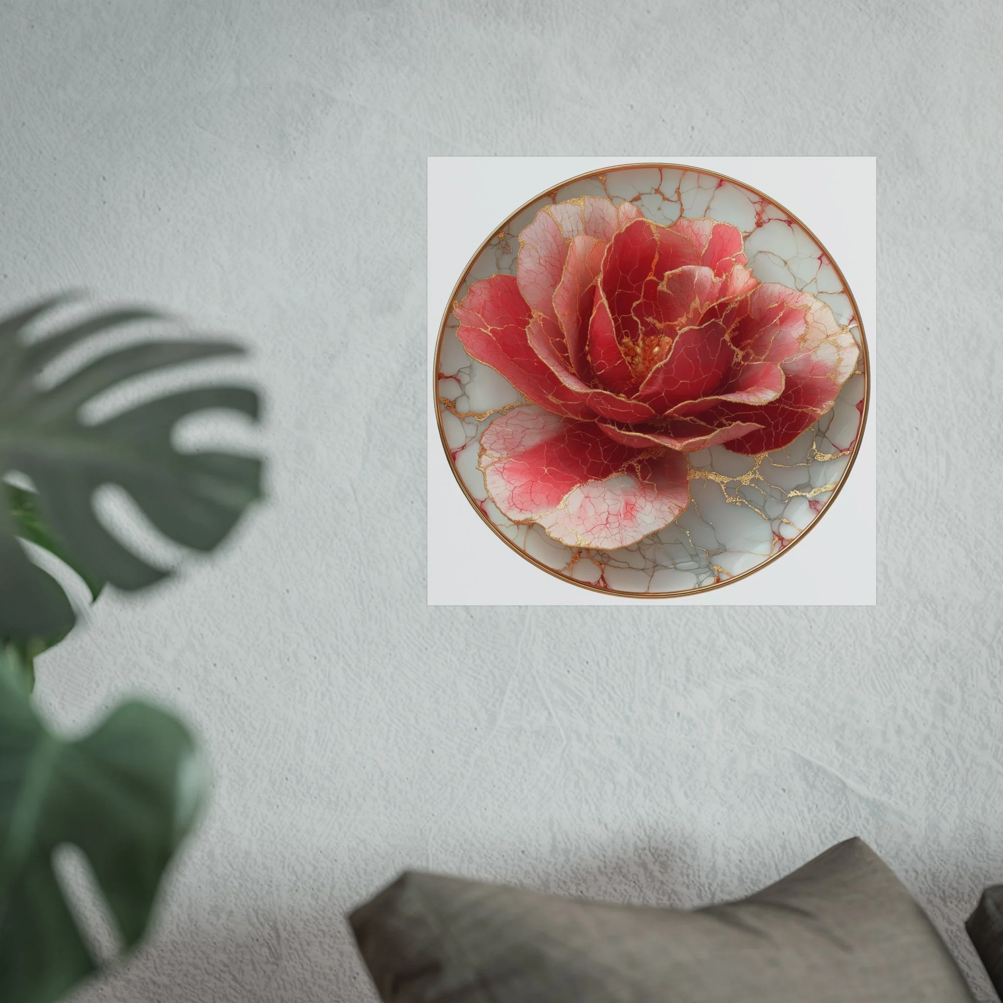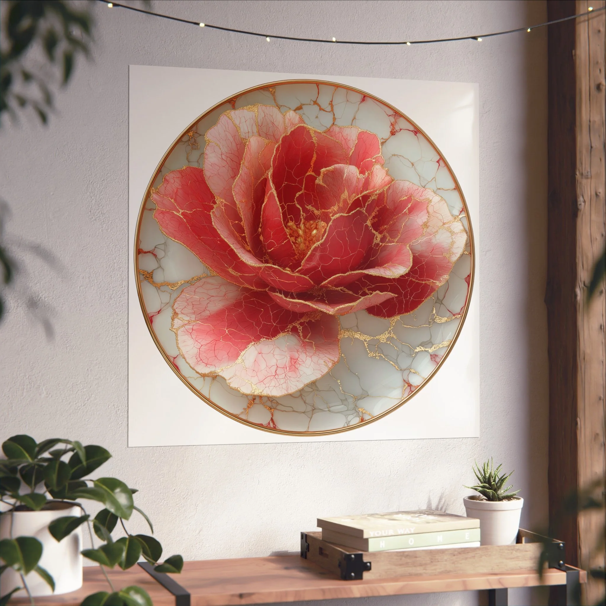 This kintsugi-inspired rose artwork highlights delicate gold seam detailing across rich botanical textures. Inspired by the philosophy of repair and renewal, each piece celebrates beauty through imperfection.