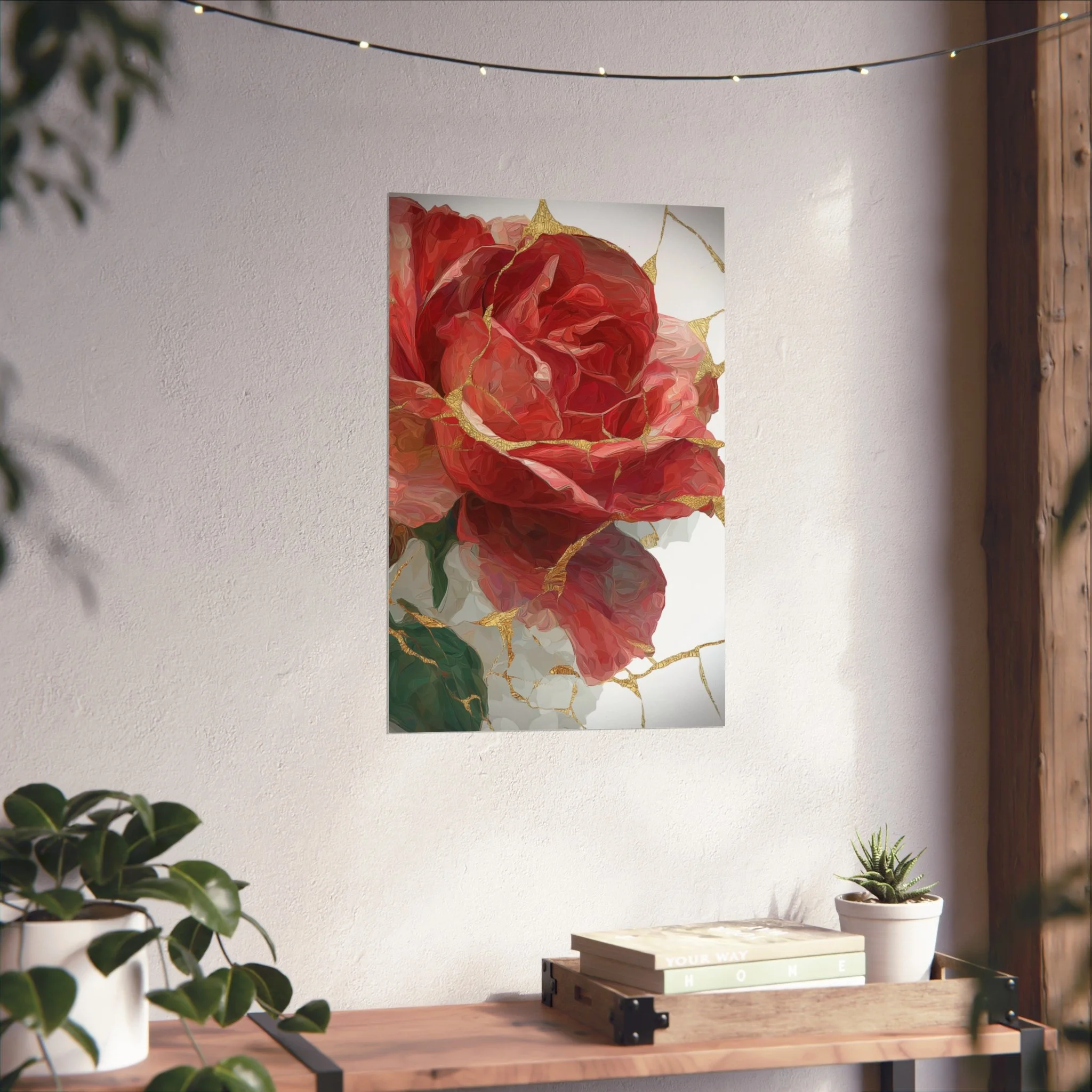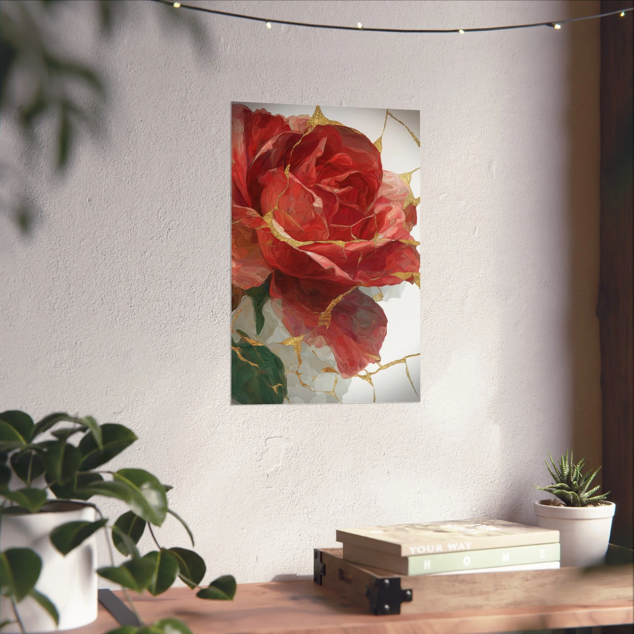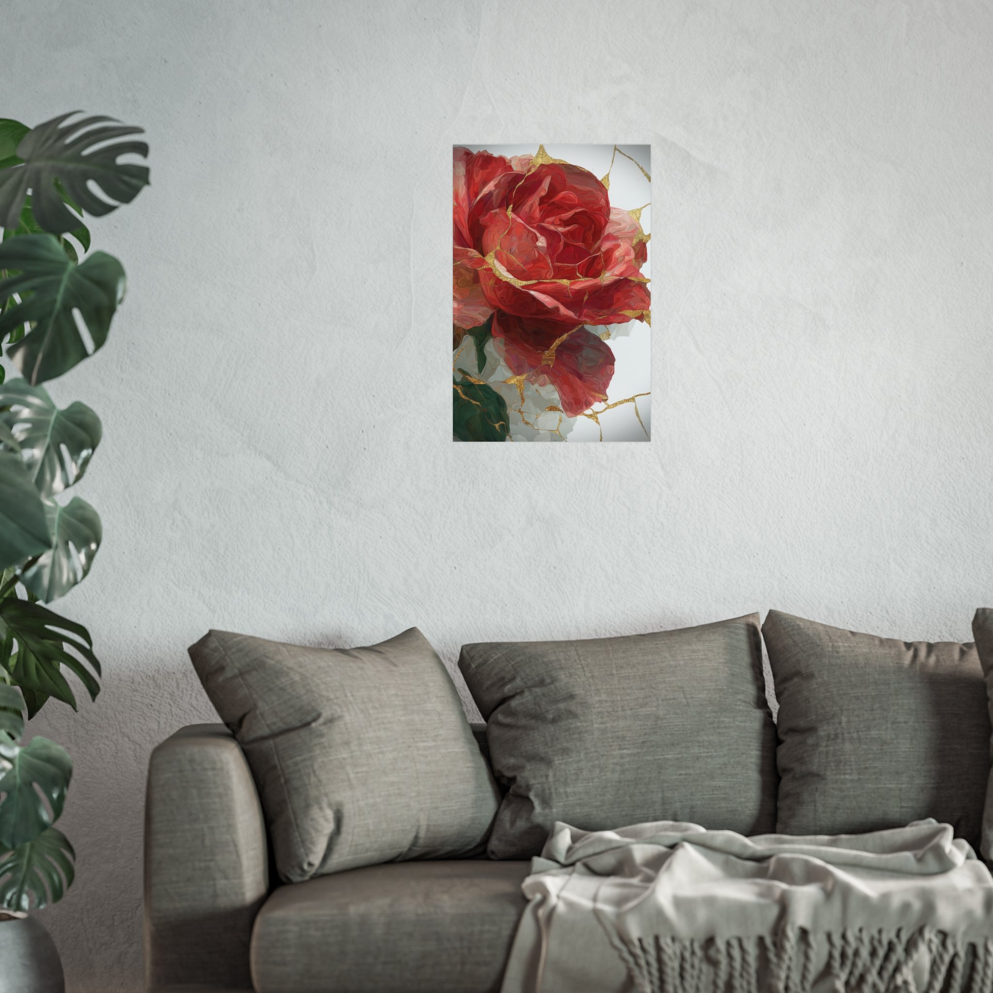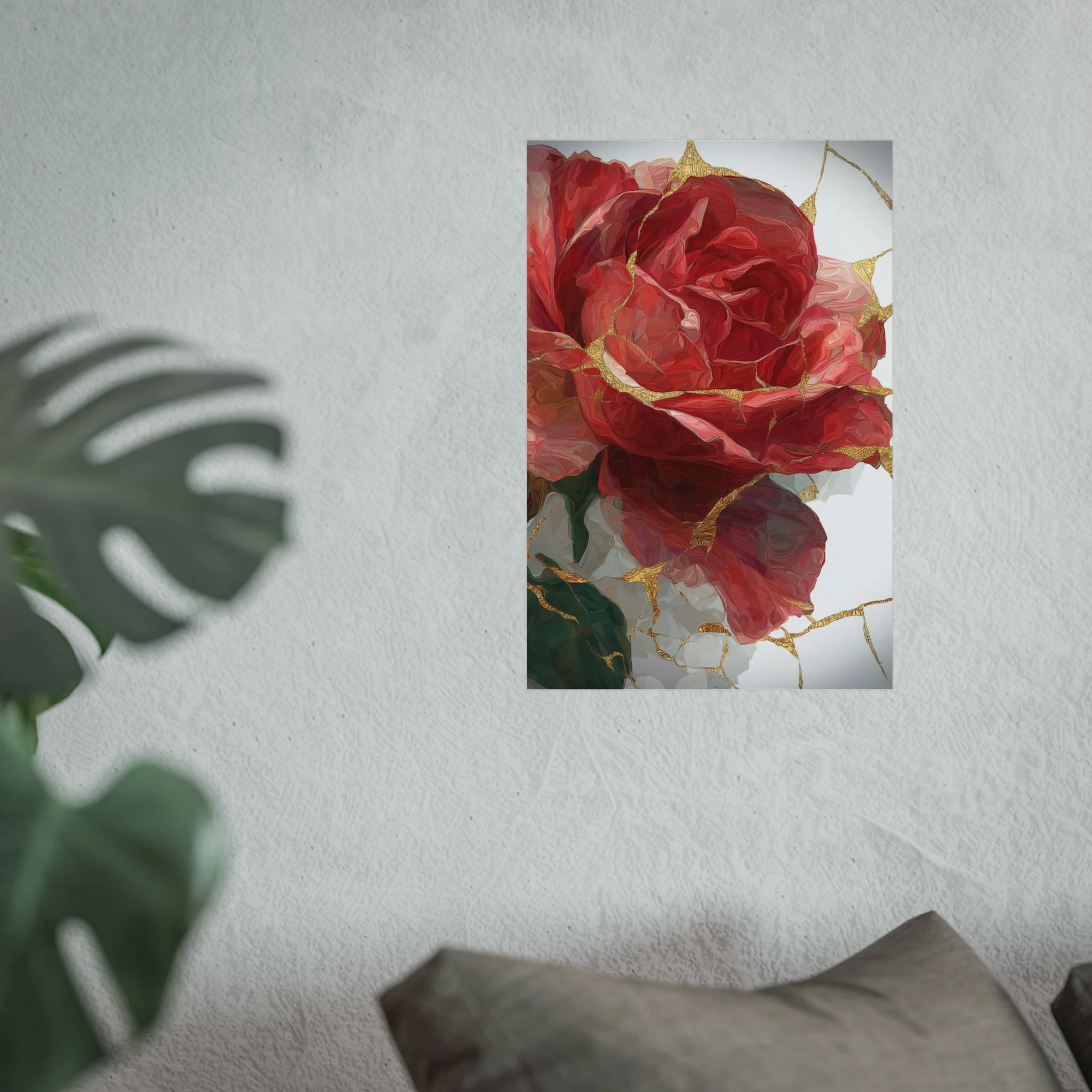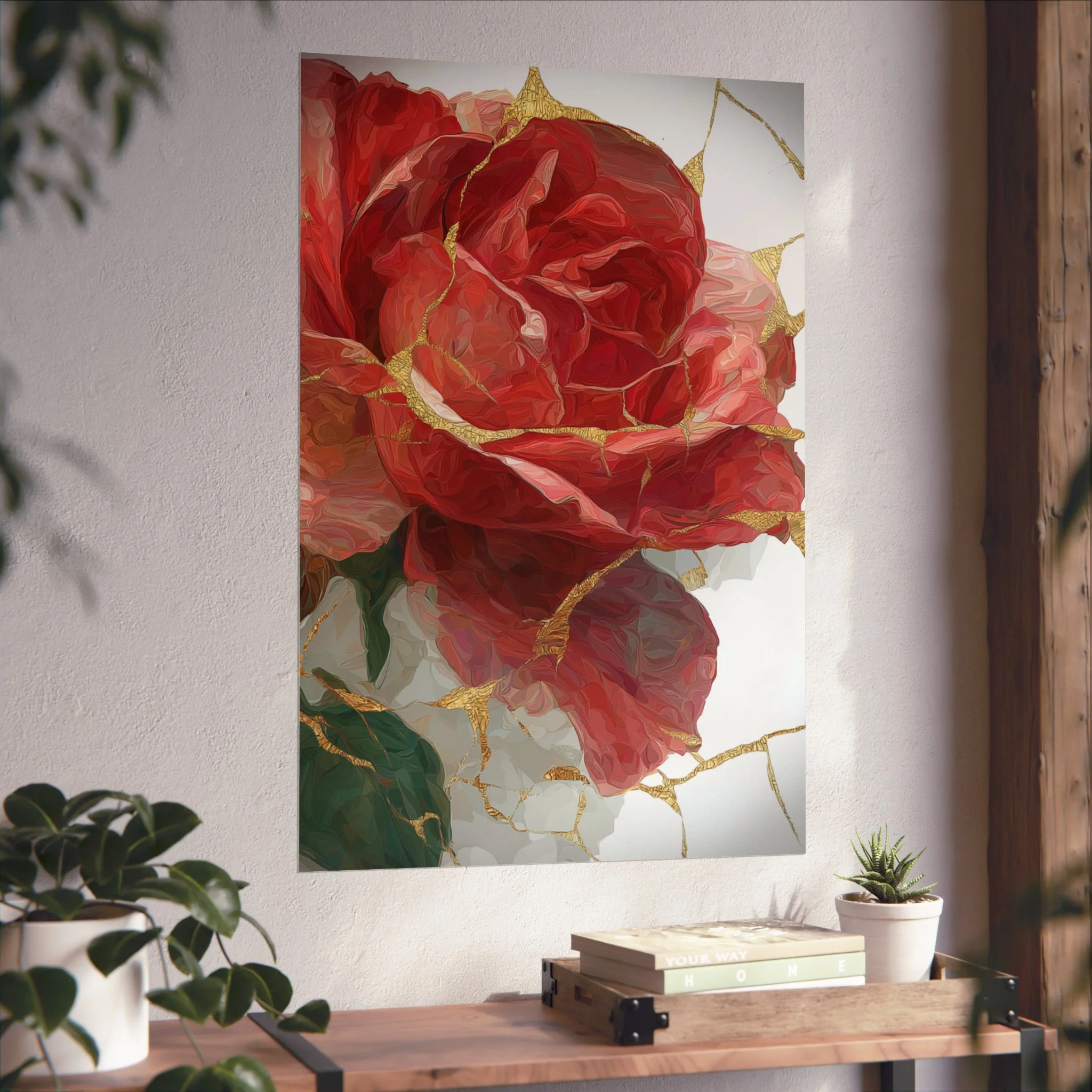 This kintsugi-inspired rose artwork highlights delicate gold seam detailing across rich botanical textures. Inspired by the philosophy of repair and renewal, each piece celebrates beauty through imperfection.