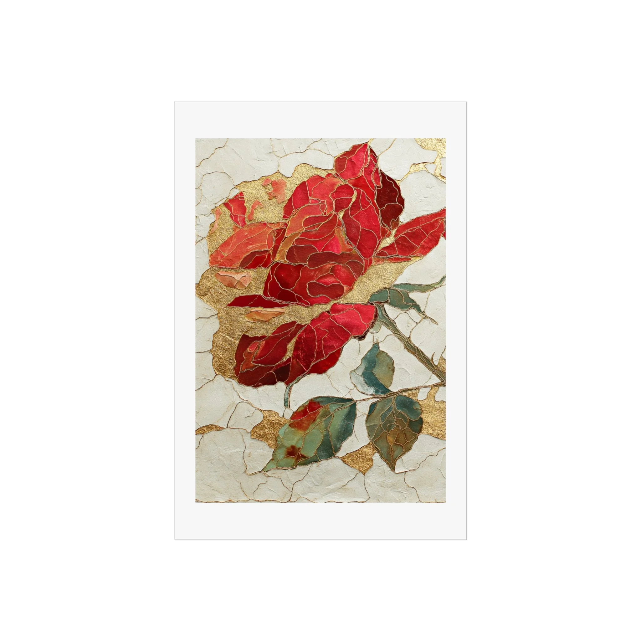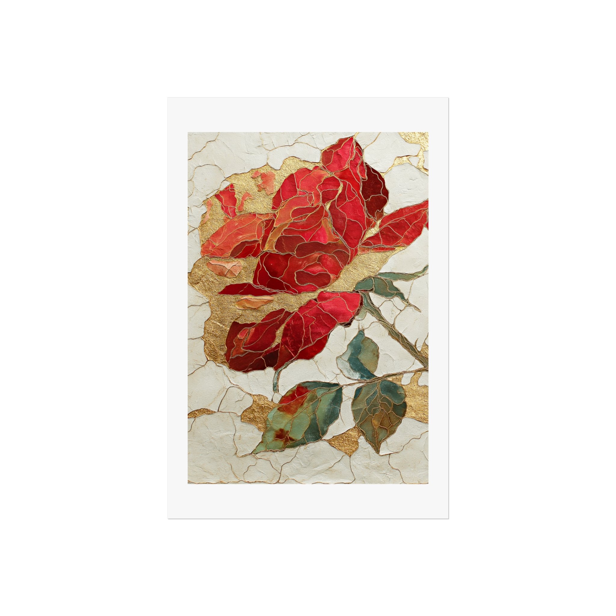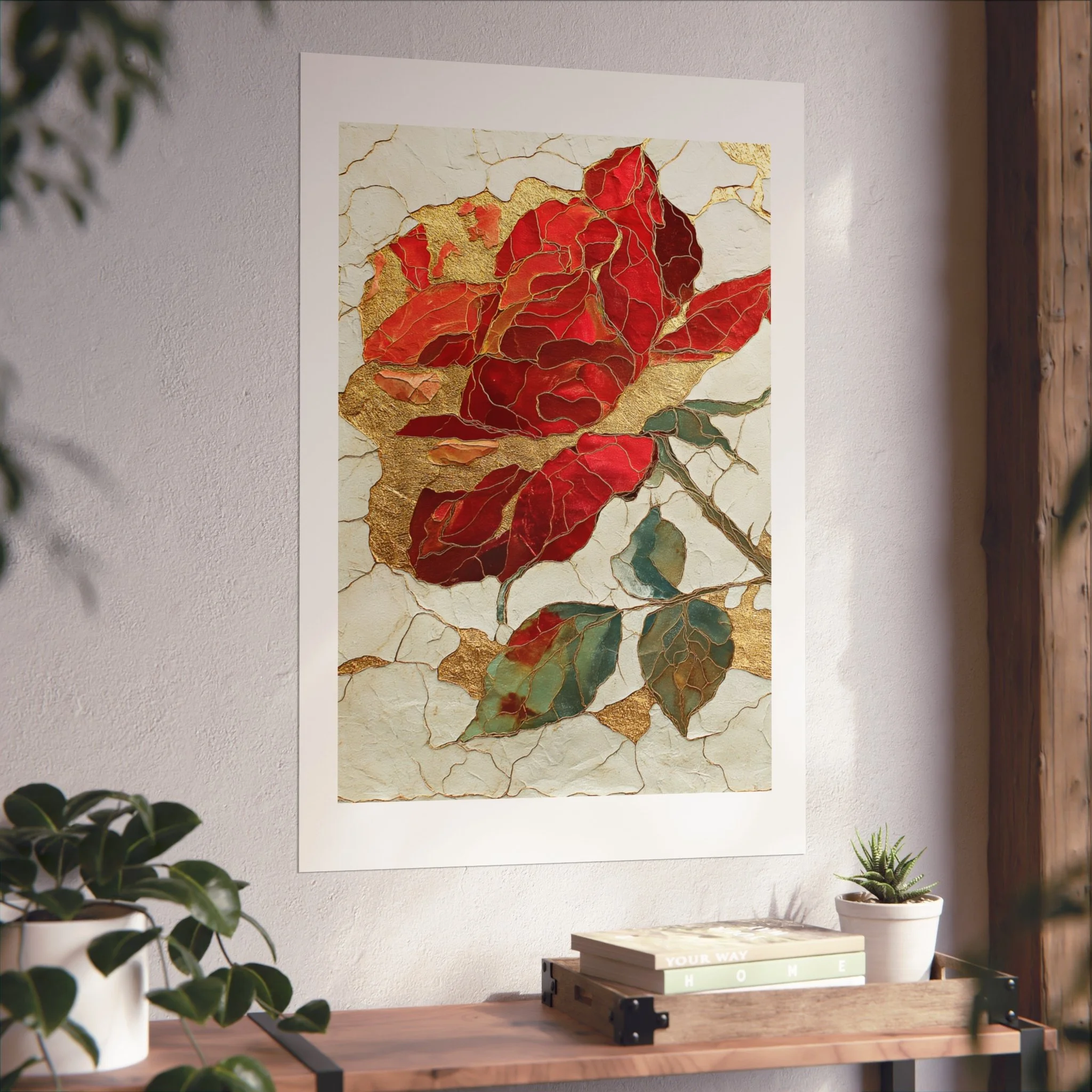 This kintsugi-inspired rose artwork highlights delicate gold seam detailing across rich botanical textures. Inspired by the philosophy of repair and renewal, each piece celebrates beauty through imperfection.
