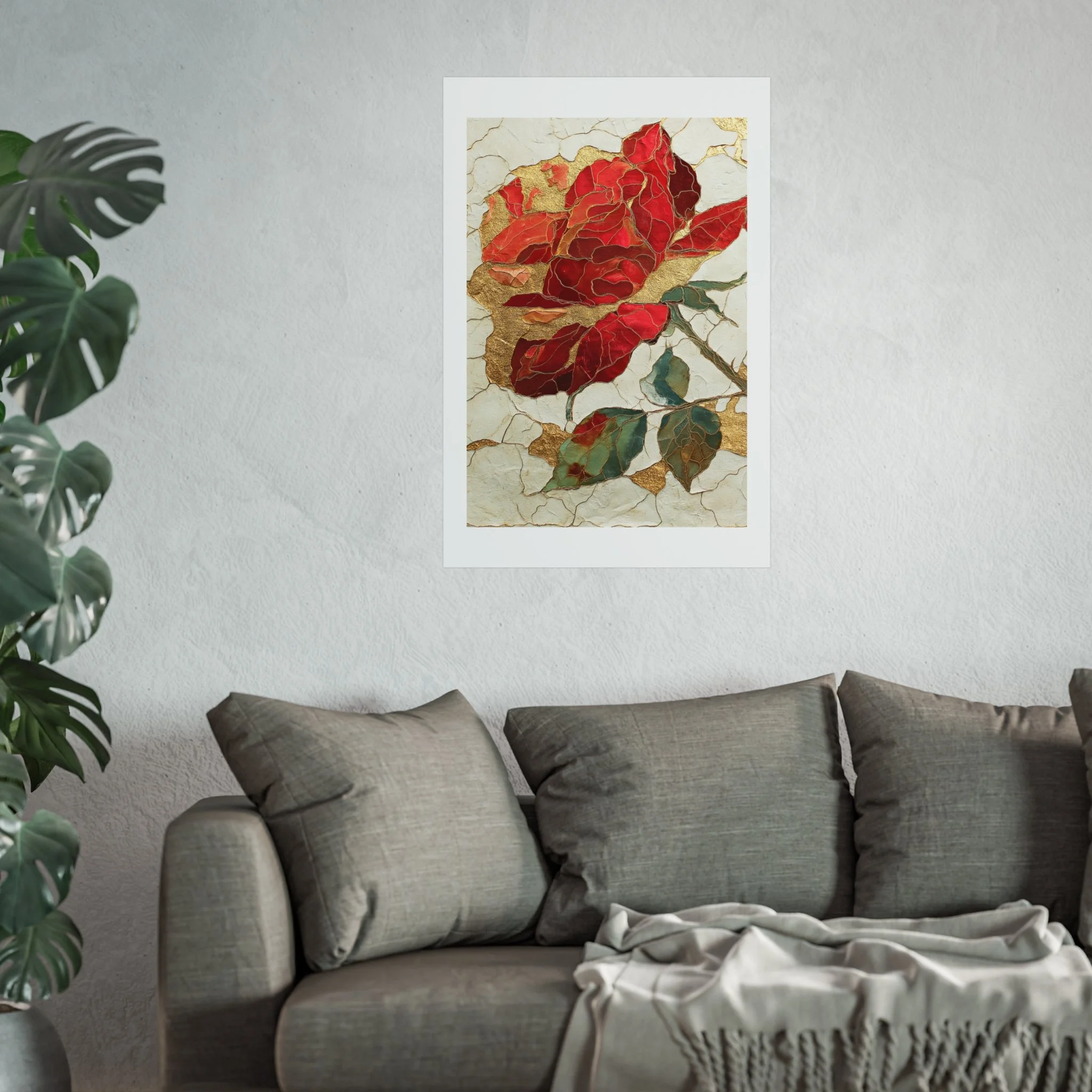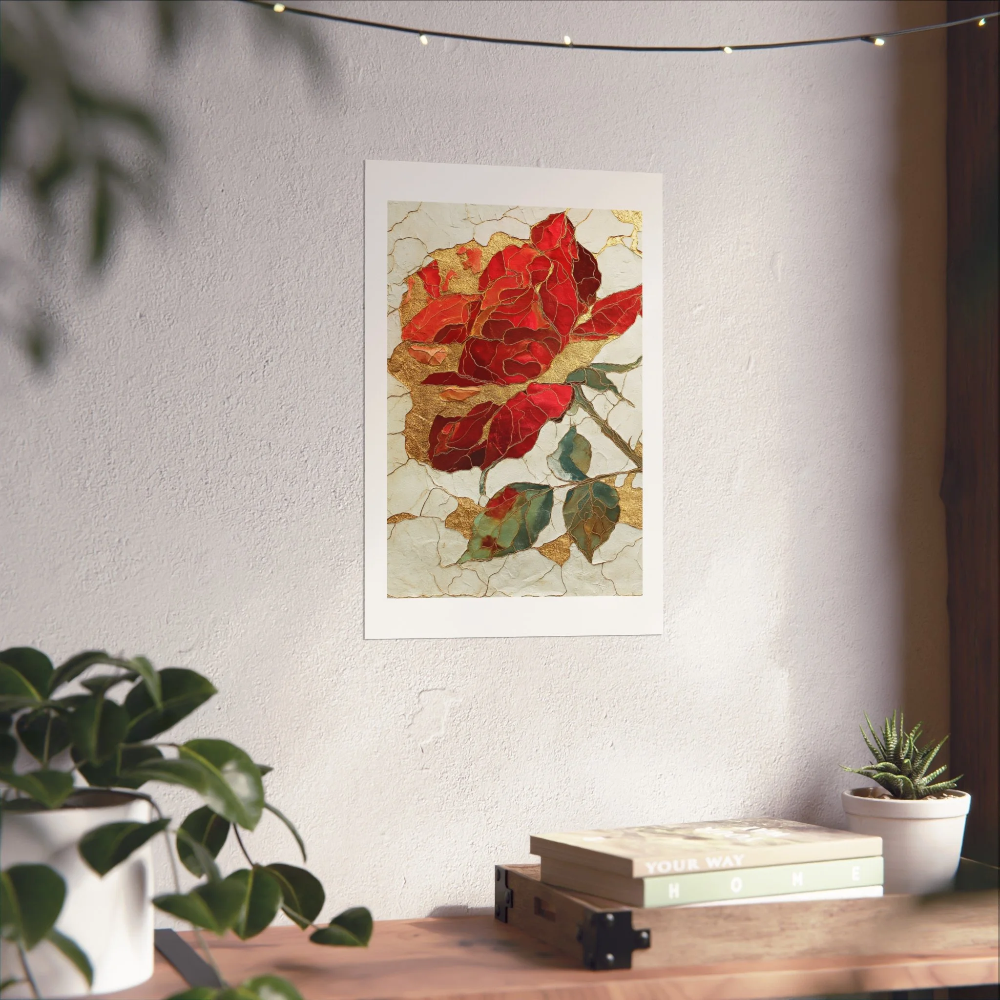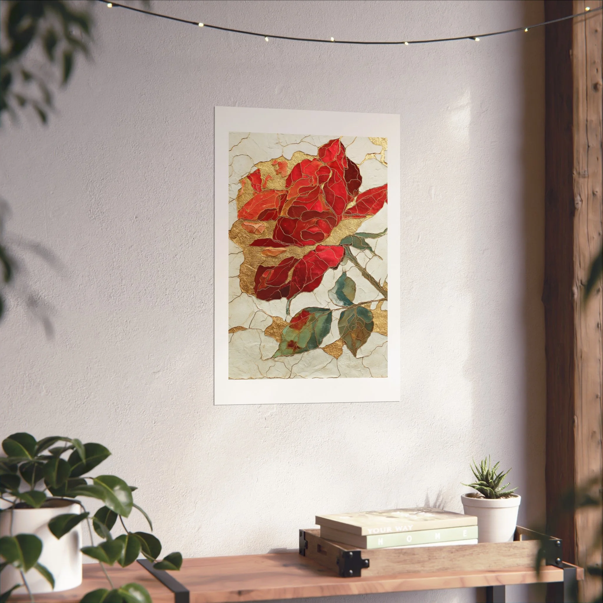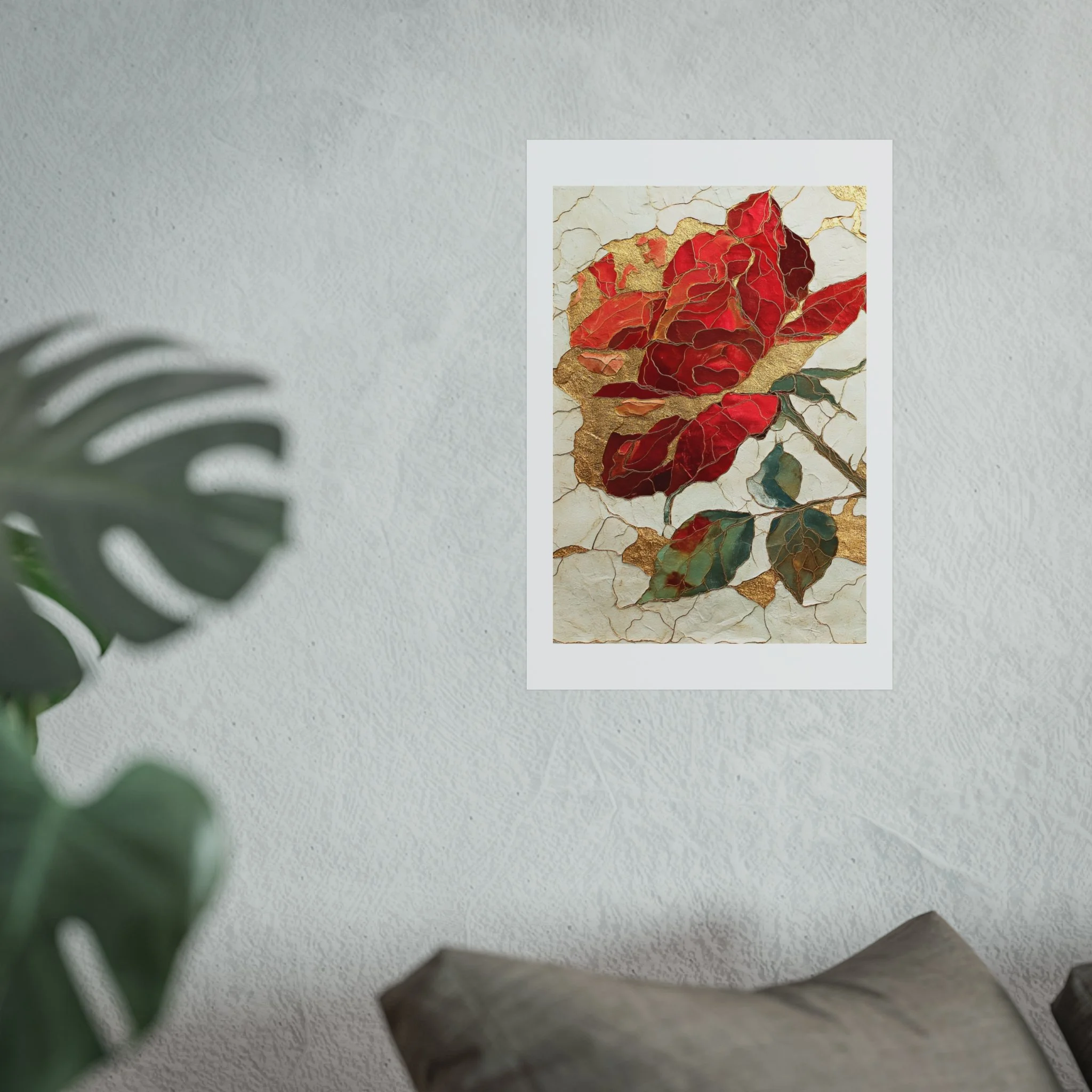 This kintsugi-inspired rose artwork highlights delicate gold seam detailing across rich botanical textures. Inspired by the philosophy of repair and renewal, each piece celebrates beauty through imperfection.