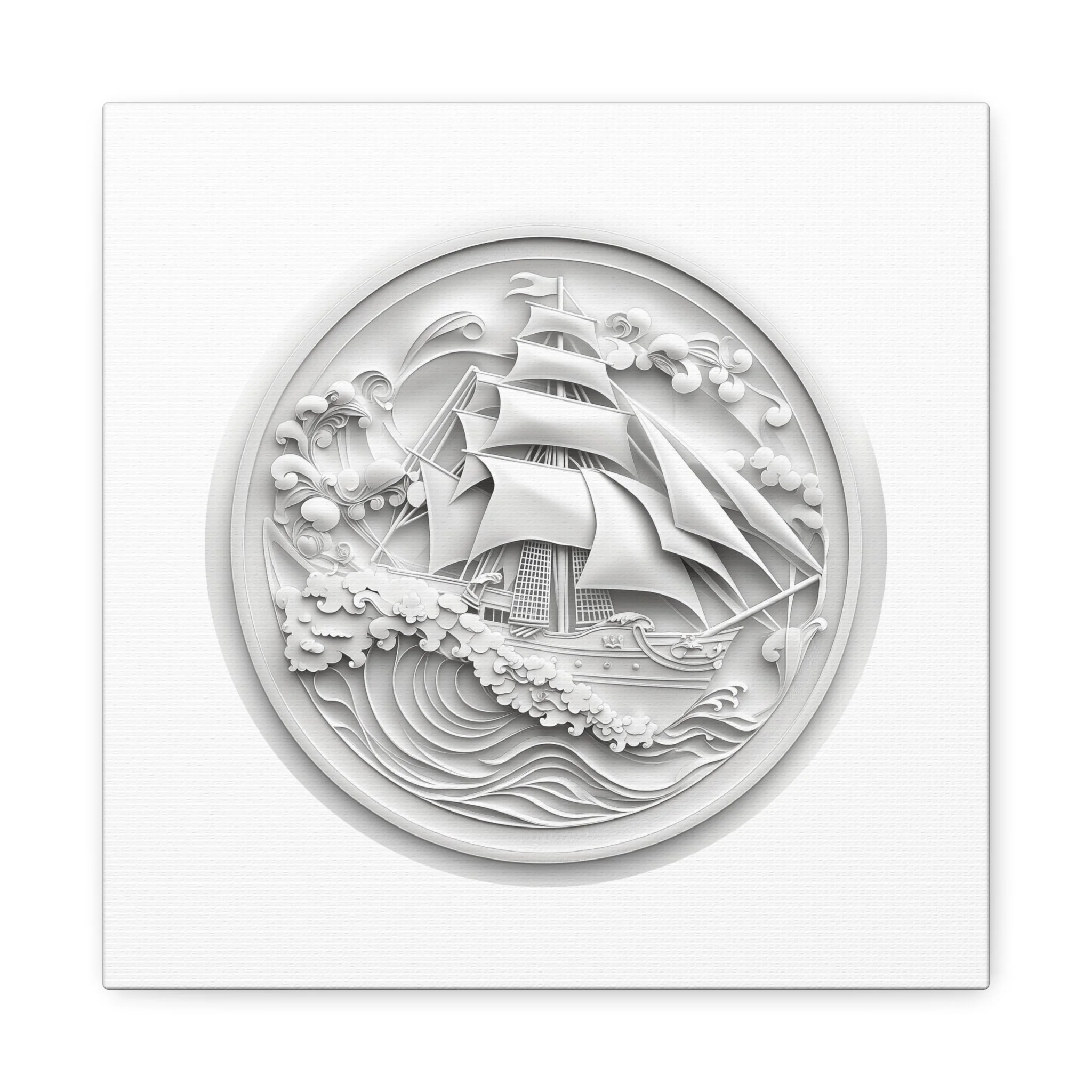 This elegant square wall print features a finely detailed maritime sailing ship rendered in a sculptural filigree relief style, inspired by traditional ivory carvings and classic nautical medallions. Flowing waves, full sails, and ornamental clouds create a timeless maritime scene that evokes the golden age of exploration.